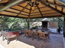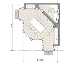 لو يتم تخصيص مساحة أكبر لشرفة المراقبة (على سبيل المثال ، 5.3×5.4 ، 6×6 م), يمكن تصميم أحد الجدران كمنطقة طهي عن طريق وضع حوض ، مرجل ، ريبنيتسا ، شواء وطاولة طبخ في هذا المكان. يمكن ملء المساحة الخالية بأريكتين وطاولة كبيرة. بدلاً من الأرائك ، يمكن تركيب أثاث بلاستيكي متحرك بالداخل ، ويمكن ، إذا لزم الأمر ، أخذه إلى الخارج لمزيد من الراحة.