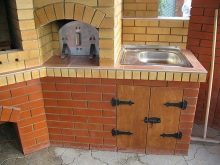 ثم يقومون بتثبيت أبواب المدخنة ، والانتهاء من وضع الأقواس فوق الشواء وموقد الطهي والموقد. بعد ذلك ، يتم إجراء التوصيل. يمكن تثبيت شبكة من الفولاذ المقاوم للصدأ فوق البلاط. مفيد للأطباق وتجفيف التوت والفطر. كل ما تبقى هو خياطة السقف وإمداد الحوض بالمياه ووضع غطاء الأرضية. للجر المستقر ، من الأفضل جعل الأنبوب ثلاثي القنوات.