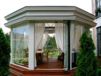 شرفات المراقبة مغلقة ملحوظة لحقيقة أنها تنطوي على عملية على مدار السنة. غالبًا ما لا تحتوي هذه المشاريع على نظام تدفئة وإضاءة فحسب ، بل تحتوي أيضًا على مصدر للمياه. الهياكل المغطاة الأكثر موثوقية ودائمة, إنها مريحة من الداخل وتشبه المنازل الريفية الصغيرة ، خاصة إذا كانت مجهزة بمجموعة من الأثاث ومنطقة للشواء مع طاولة كبيرة وغطاء وموقد وجميع الاتصالات. في مثل هذه الهياكل ، تكون حلول التصميم ذات النوع الكروي أو الشبيه بالإبريق من نحاس التندور لطهي مجموعة متنوعة من الأطعمة مناسبة أيضًا..