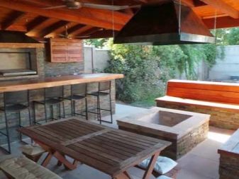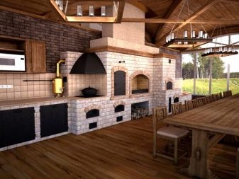 على سبيل المثال, الشاليه به سقف عريض ، به أفاريز ضخمة. داخل الهيكل المستطيل يوجد مكان للطبخ ومنطقة تناول الطعام. يمكن أن يحاط الموقد بطاولة ذات سطح عمل حجري حول المحيط ، ويمكن وضع الحوض على إحدى الطائرات ، تاركًا مدخل الموقد. يمكنك تحديد منطقتين وظيفيتين بقسم على شكل شعرية أو تزوير مفتوح.