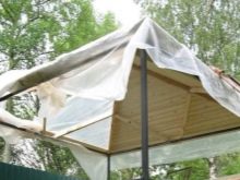 المرحلة التالية من التثبيت هي الكسوة. أولاً ، قم بتغطية السقف. ثم تعلق الجدران الجانبية والأرضية. في هذه الحالة ، من الأفضل استخدام الألواح الخشبية كأرضية. وفقًا لميزات تصميم الشجرة ، يجب أن يكون منحدر العوارض الخشبية الرئيسية لسقفها 10-15 درجة على الأقل. من أجل تقوية السقف بشكل أكبر ، يمكن تركيب الخراطة باستخدام أنابيب جانبية بقياس 20 × 20 مم. بينهما خطوة 40 سم..