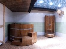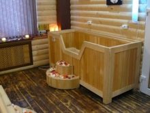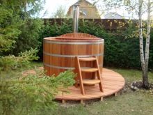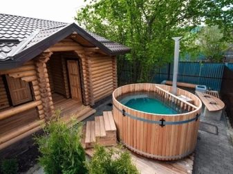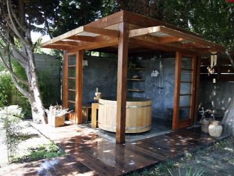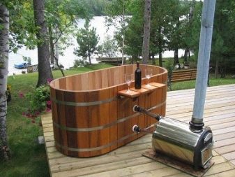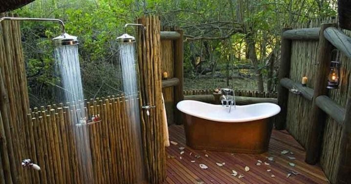 يمكن استخدام حوض الاستحمام القديم المزين ، والذي تم تركيب موقد من الفولاذ المقاوم للصدأ تحته ، كحوض استحمام ساخن. يمكن تركيب صندوق مستطيل للاستحمام في الهواء الطلق والدش الخارجي مباشرة في الخارج في المنطقة المفتوحة أو على الشرفة.