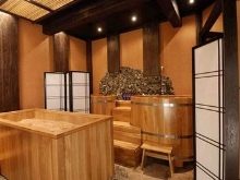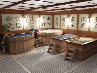 الحمام الياباني عبارة عن غرفة فسيحة مليئة بالأشياء والأغطية الخشبية. سمات الحمام الرئيسية هي برميل كبير من الماء (furako) ، خطوط مستطيلة (ofuro) مع نشارة الخشب أو الحجارة ، أرائك للتدليك.
