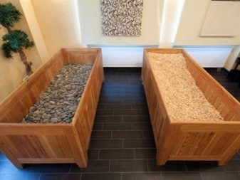 عادة ما يتم ملء حوض أفيورو آخر بحصى الأنهار. نظام التسخين وحجم حوض الاستحمام الساخن يكرران الإصدار السابق تمامًا. يستلقي الشخص على الحجارة الساخنة بظهره ، ويمد العمود الفقري ويستقيمه قدر الإمكان.