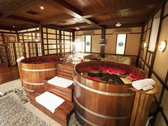 في بناء الحمامات اليابانية ، وكذلك الحمامات الروسية ، يتم استخدام المواد الطبيعية ، والجزء الرئيسي منها هو الخشب. بالنسبة لأوفورو وفوراكو ، يفضل خشب الأرز أو البلوط. هذا النوع من الخشب هو الأكثر متانة ، بالإضافة إلى خصائصه العلاجية. تُستخدم الصنوبريات (الصنوبر أو الصنوبر) في خيارات أكثر اقتصادا ، ولكن يجب أن يؤخذ في الاعتبار أنه في درجات الحرارة المرتفعة ، ستطلق الأخشاب الصنوبرية الراتنج. تتم معالجة الطلاءات الخشبية في الحمام بمطهر ، مما يزيد من مدة خدمتها.