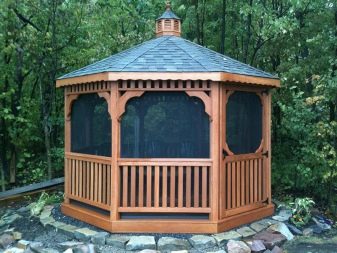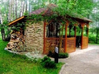 في هذه الحالة ، قد تتعلق الخيارات الأصلية بالاختلافات في أصغر التفاصيل. على سبيل المثال ، حتى أكشاك المراقبة الأكثر تواضعًا ستبدو مختلفة تمامًا وغير عادية جدًا إذا تمكن البستاني من تغطيتها بنباتات التسلق. يمكن أن يستغرق إنشاء هيكل من هذا النوع أكثر من عام ، ويبدو رائعًا فقط في الصيف ، ولكنه يوفر ظلًا إضافيًا ويجعل الشخص أقرب إلى الطبيعة..