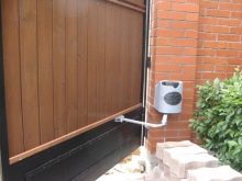 يتم تثبيت المحرك الكهربائي من النوع الخطي على أعمدة إضافية ، مما يوفر مساحة على الموقع. ومع ذلك ، فإن العيب الكبير في هذه الحالة هو تقييد فتح البوابة إلى 90 درجة. زاوية الحركة تقيد مرور السيارات العريضة.