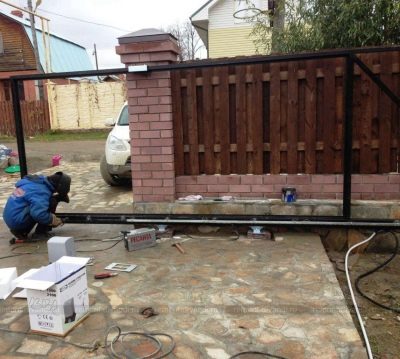 يتم دفع العارضة إلى المدخل ، ثم يتم إرفاق عربات الدعم ويتم لحام الإطار بالعارضة. الانتهاء من العمل هو مرفق القوس العلوي ؛ كل كتلة مطلية بالطلاء التمهيدي. بعد وضع الإطار في مكانه ، يمكنك البدء في العمل مع الغلاف. عادة ما يتم تغليف البوابات المنزلقة بنفس مواد الديكور مثل البوابات المتأرجحة. تبدأ عملية الأتمتة بربط رفوف التروس بمحركات الأقراص. سوف يتحكم هذا السكة في مسار اللوحة القماشية..