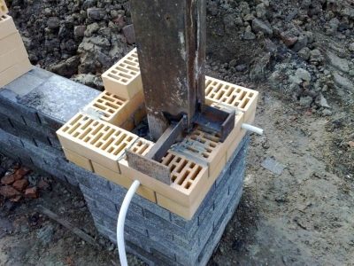 يجب إنشاء أساس لا يقل عن 1.5 متر إذا تم تركيب عمود من الطوب أو الخرسانة أو الحجر الطبيعي. يجب إزالة العناصر المضمنة الملحومة في الأنبوب خارج محيط العمود ، ثم يتم لحام الحلقات عليها. عند اكتمال كل هذا ، يتم تغطية المنتج بالطوب ويتم تشكيل عمود ، يتم ملء الداخل بالخرسانة. من المهم أن تتذكر ذلك يجب أن يتصلب الأسمنت لمدة 7 أيام على الأقل. يتم إجراء الخياطة على الوجهين بطريقة تتدفق مادتها مع أنابيب الإطارات الخارجية.