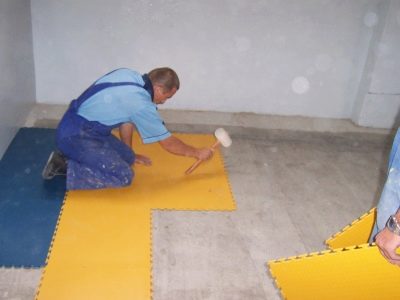 إذا تعرضت الأرضية لأحمال طفيفة فقط ، فبدلاً من لصق المادة على الأرض ، يتم تثبيت حواف اللوحات. الوحدات مجهزة بإسقاطات لرسو السفن. بعد توصيل الوحدات ، يتم ختم اللحامات بمادة مانعة للتسرب. في حالة حدوث تلف للطلاء ، يتم استبدال الجزء التالف ، بينما لا يتم فتح الجزء الرئيسي من الأرضية. العمر التشغيلي لمثل هذا الغطاء الأرضي هو عشر سنوات على الأقل..