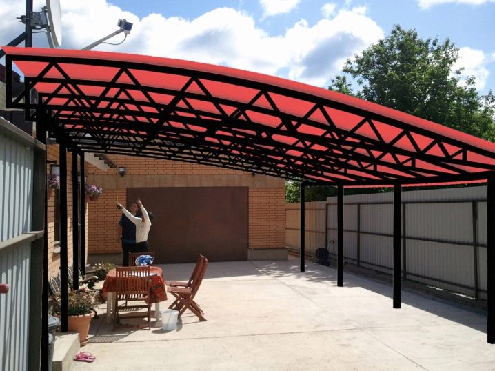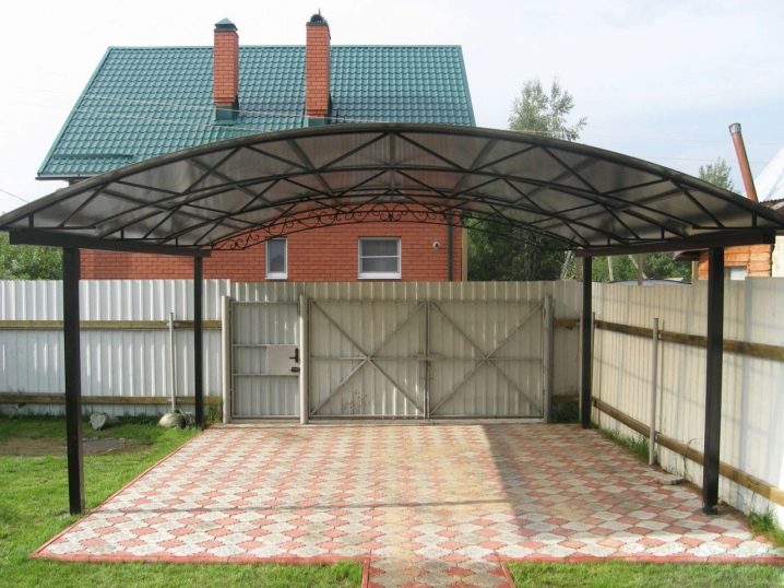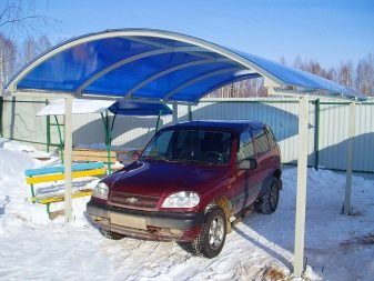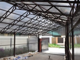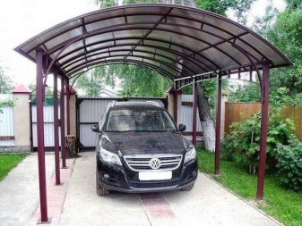 من هذه المواد يمكنك بناء مظلة مغلقة. سيبدو مثل شرفة لسيارة. يمكن أيضًا صنع مثل هذا الهيكل من مواد أخرى – باستخدام قضيب أو أعمدة من الطوب أو الأنابيب الفولاذية ، وصفيحة جانبية للسقف والجدران.