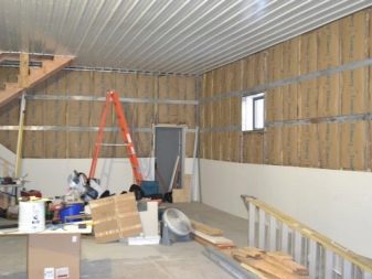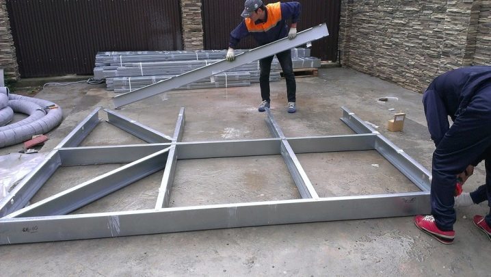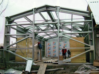 بالنسبة إلى المرآب المصنوع من الألواح العازلة ، بعد صب الأساس ، من الضروري تركيب إطار يتم تركيب الألواح المعدنية عليه. لا يختلف تصميم الإطار بشكل خاص عن تلك التي يتم تركيبها بأيديهم عند تغليف الجدران داخل الغرفة بجدران دريوال. يتم أخذ الملامح الرأسية والأفقية ، وتثبيتها مع مفك البراغي ومسامير التنصت الذاتية ، وكذلك وصلات العبور والأقواس الخاصة.