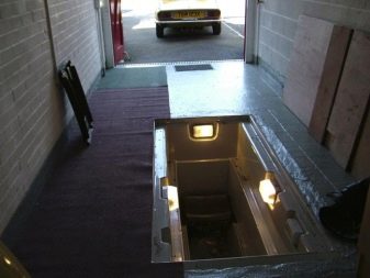 من الممكن أيضًا تجهيز ليس فقط حفرة للمشاهدة ، ولكن قبوًا حقيقيًا لتخزين الفراغات لفصل الشتاء ، والأشياء غير الضرورية. في مثل هذا المرآب ، يمكنك تنظيم مجموعة أدوات صغيرة عن طريق تثبيت الرفوف والأرفف وطاولة العمل وحتى المغسلة..