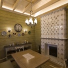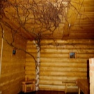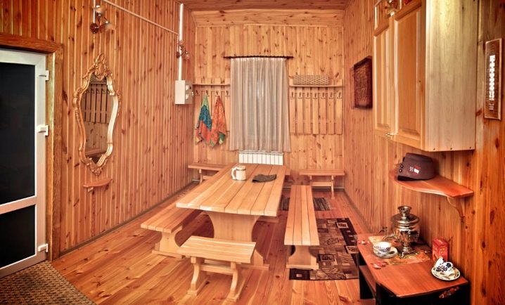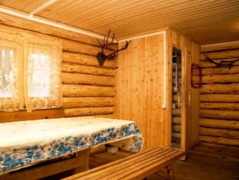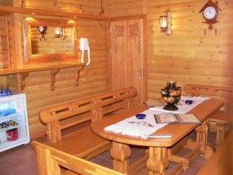 الأثاث في غرفة الاستراحة هذه مصنوع بيديك من خشب الصنوبر الصلب أو تم شراؤه جاهزًا ومُكمّل بالديكور من صور الإغاثة على شجرة مع موضوع الحمام. تبدو الجدران الخشبية جميلة كرمز للثقافة الروسية التقليدية. بالنسبة لخيارات الميزانية ، يتم استخدام منزل كتلة مصنوع من البلاستيك, تقليد أنواع مختلفة من الخشب.