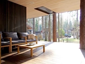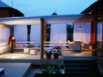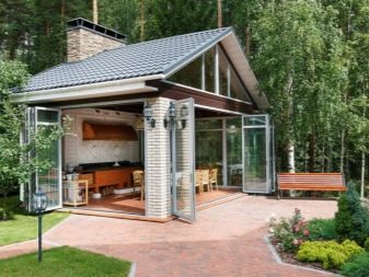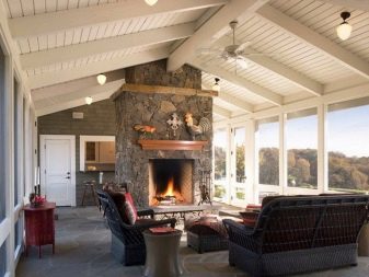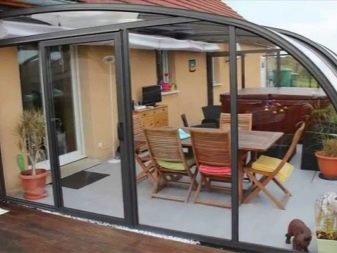 المجموعة الثالثة من المشاريع – مع إزالة غرفة الترفيه على الشرفة. هذا التصميم مناسب للاستخدام في الصيف. في موسم البرد ، يجب أن يكون التراس مزججًا ويجب التفكير في نظام تدفئة. ومع ذلك ، فإن مثل هذا الترتيب لغرفة الاستراحة يعطي مجالًا كبيرًا لتنفيذ حلول التصميم..