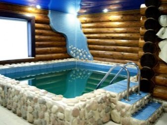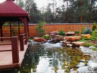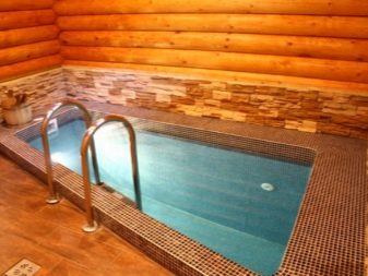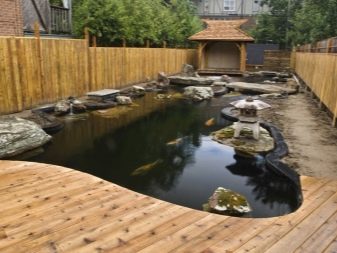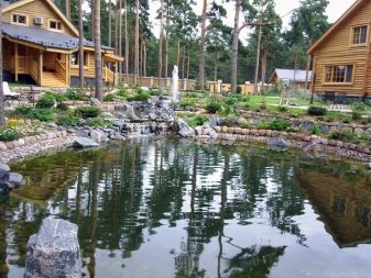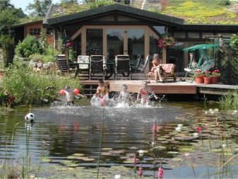 يمكن أن يكون للخزان مخططات هندسية صارمة أو يكون قريبًا من الشكل الطبيعي. في هذه الحالة ، تم تزيين الشاطئ بالحصى والنباتات: hosta ، astilbe ، الحبوب. يتم إغلاق الحمام مع حوض السباحة على الشرفة من أعين المتطفلين بواسطة سياج من الشجيرات المزهرة أو الكروم على الدعامات.