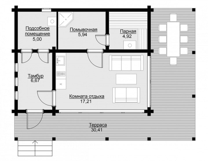تعتبر الساونا مع التراس خيارًا رائعًا لتناول الوجبات الصيفية في الهواء الطلق بعد إجراءات الساونا. يمكن وضع شواية في الموقع أمام الحمام أو يمكن إدخال منطقة الشواء في مساحة الشرفة الأرضية. للقيام بذلك ، يجب زيادة حجم الشرفة لتوفير وصول مجاني إلى الموقد وتجنب الدخان من طاولة الطعام والنوافذ..