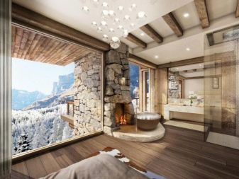 ديكور الغرفة يفضي إلى المحادثات وهواية هادئة. أثاث مريح مناسب ، كراسي بذراعين مع مساند للذراعين, تذكارات الصيد واللوحات مع مشاهد الصيد معلقة على الجدران. في تصميم طراز الشاليه ، يتم استخدام التفاصيل التي تم إجراؤها بطريقة حرق الأخشاب على نطاق واسع ، مما يضيف الصلابة والريف إلى الداخل. يعد الخشب والحجر من المواد الأساسية لتزيين غرفة الاستجمام على طراز الشاليه.