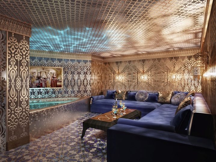 تم تزيين جوانبها ببلاط صغير ، ويمكن أيضًا تزيين الأثاث بنمط بلاط الفسيفساء. الخطوط الناعمة والزخارف العربية في الديكور والألوان الزاهية والأرائك الكبيرة المريحة مع العديد من الوسائد هي السمات المميزة للديكورات الداخلية الشرقية..