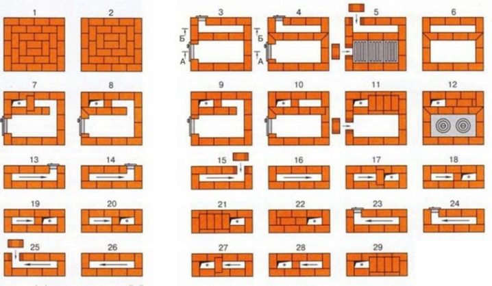 يتم وضع الصفين الأولين من الطوب أفقياً ، وفي الصف الثالث يتم تشكيل جدران الفرن. غرفة تكديس الحطب مصنوعة من 3-6 صفوف. ثم يتم إصلاح الباب. 7 بجانب الطوب ، تحتاج إلى وضع حتى لا يزال هناك ثقب صغير. يتم وضع 8 طوب بجانب بعضها البعض بشكل مسطح ، و 9 – على الحافة. بعد ذلك يتم التضييق مرة أخرى بوضع الصف العاشر. يتم وضع الصف الحادي عشر أيضًا على الحافة. يجب وضع صفوف أخرى بنفس الطريقة. ثم يتم توصيل الموقد بالمدخنة.