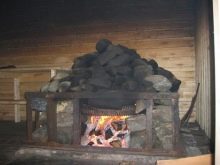 تم صنع الموقد في مثل هذا الحمام بدون مدخنة., أدى الدخان الساخن إلى تدفئة الغرفة ، مما أدى إلى تدمير البكتيريا. قبل دخول غرفة البخار ، كانت تهوية الحمام من خلال نافذة صغيرة وباب مفتوح.