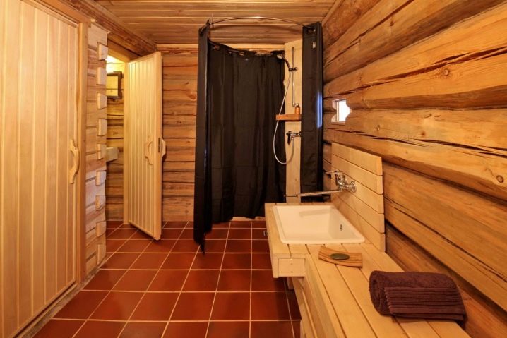 تم الانتهاء من الدش والمسبح بمواد مقاومة للرطوبة: البلاط أو الألواح البلاستيكية أو الحجر الطبيعي. يجب أن تكون الخامة صحية وسهلة التنظيف للحفاظ على نظافة الغرفة. في منطقة محدودة ، بدلاً من حوض السباحة ، يتم تثبيت برميل سباحة ، وفي هذه الحالة ، يمكن أن تكون الغرفة بأكملها مصنوعة من الخشب.