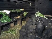 طهر السخام الأسطح ، وأصبحت الجدران السوداء الدخانية معقمة تمامًا. كان هناك أيضًا حوض أو حوض به ماء ، حيث تم غسل المستحم من السخام ، والذي حل في خصائصه محل الصابون. ينتج الماء بخارًا رطبًا يخترق المسام وينظفها. الأكثر صلابة انغمست في حفرة جليدية أو نهر ، لذلك تم وضع الحمام على حافة القرية ، ويفضل أن يكون بجانب خزان.
