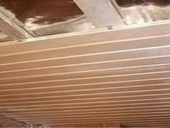 - أولاً ، يتم تثبيت مادة حاجز بخار على عوارض السقف. يوصى باستخدام اللوحات التي يكون أحد جوانبها عبارة عن احباط. يجب تركيب حاجز البخار مع تداخل صغير بطول 10 سم (يجب عمل نهج مماثل على الجدران).