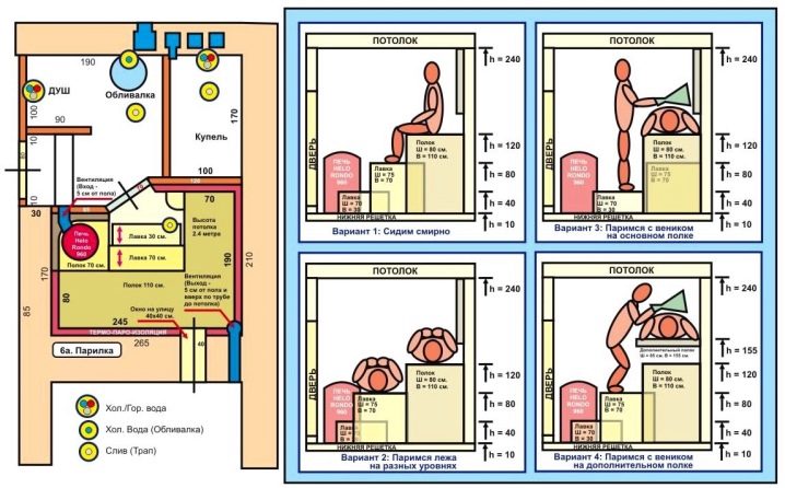 - غرفة البخار – هذا هو قلب أي حمام ، يجب أن يسخن بسرعة ويحافظ على الحرارة لفترة طويلة. يوجد أرفف وموقد هنا. عادةً ما توجد المقاعد على ثلاثة مستويات ، بحيث يمكنك الجلوس في المستويين الأولين ، وفي المستوى الثالث ، وهو ضعف العرض ، للاستلقاء. يجب أن تكون غرفة البخار بعيدة قدر الإمكان عن الباب الأمامي. تعتمد أبعادها على عدد الأشخاص الذين سيتم تبخيرها في نفس الوقت ، وكقاعدة عامة ، لا توجد نوافذ في غرفة البخار..