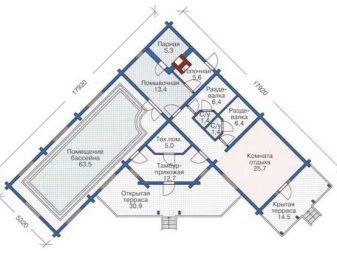 في بعض المناطق ، ليس من الممكن دائمًا تخصيص مساحة كبيرة للحمام ، وفي مثل هذه الحالات ، يمكنك اللجوء إلى حل غير قياسي. يمكن اعتبار خيار غير عادي مشروع حمام الزاوية. ميزتها الرئيسية هي أن غرفة الاستراحة وغرفة البخار تقعان فوق زاوية 90 درجة بالنسبة لبعضهما البعض. وبالتالي ، يقع الموقد في الجزء المركزي ويمكنه تسخين جميع الغرف في وقت واحد ، وهو أمر ضروري بشكل خاص في فصل الشتاء..