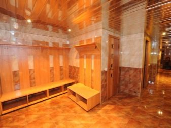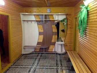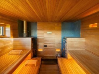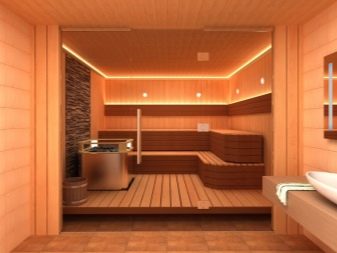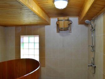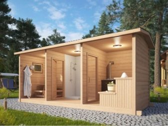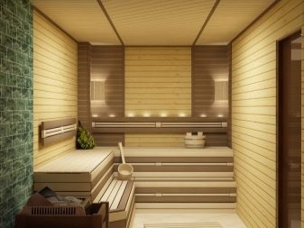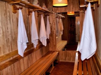لتوفير مساحة ، في هذه الحالة ، يمكن وضع مقعد وخطافات للملابس في غرفة خلع الملابس الصغيرة. ومع ذلك ، يُنصح بتخصيص غرف منفصلة لغرفة البخار وغرفة الغسيل ، لأنه لا يمكن للجميع تحمل درجات الحرارة العالية مع الرطوبة العالية..