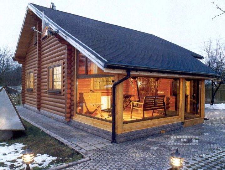 - في الحمام المكون من طابق واحد ، لا يوجد دائمًا مكان لغرفة استرخاء واسعة ، ولكن في هذه الحالة ، يمكنك ترتيب شرفة أو شرفة أرضية مغطاة للاسترخاء بعد غرفة البخار. سيتم تقدير هذا الخيار من قبل عشاق الترفيه الكامل والمريح في الهواء الطلق..