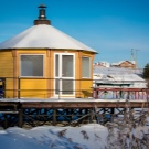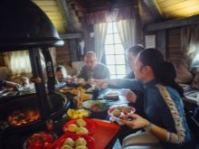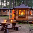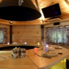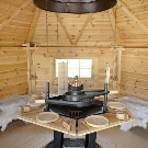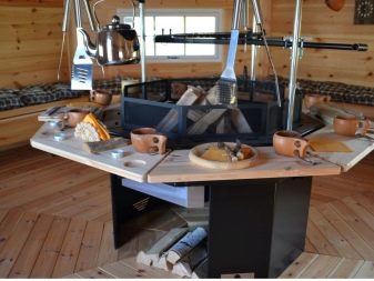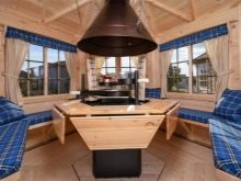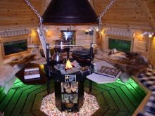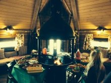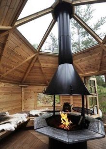 تم تصميم الجزء الداخلي لما يسمى بالمنازل الفنلندية بطريقة قياسية – يوجد في وسط الغرفة موقد عالمي وملحقات إضافية على شكل دخان وبصقة وشواء. بالإضافة إلى ذلك ، من أجل قضاء وقت ممتع ، يكتمل التصميم بطاولة ومقاعد مزينة بجلود أو وسائد للحيوانات..