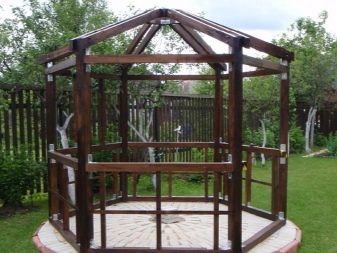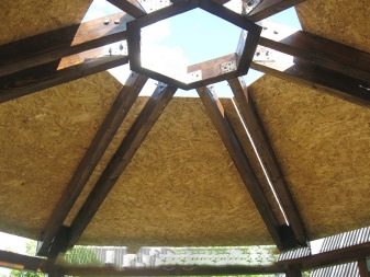 ستكون الخطوة التالية هي تركيب السقف. للقيام بذلك ، قم أولاً بتجميع إطارها من الألواح بقسم 50 × 100 مم. من الأفضل اختيار تصميم سداسي, بسبب القطر الداخلي سيخلق مسدسًا يتناسب مع أنبوب الموقد. سوف تكون العوارض الخشبية المعدة من الألواح ذات الحواف بمثابة أساس للسقف. يجب أن يتم تثبيتها بزوايا معدنية ومسامير..