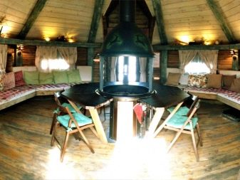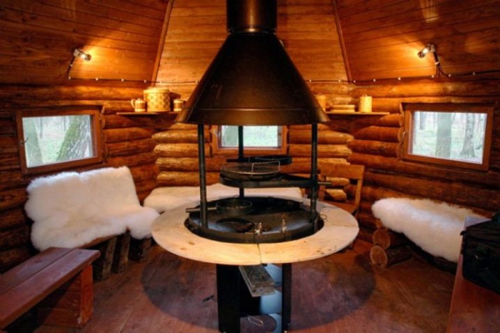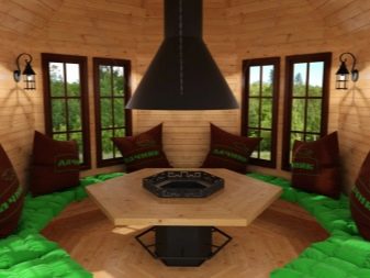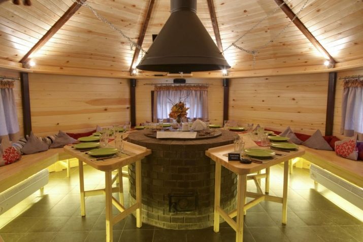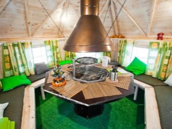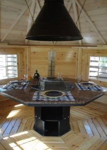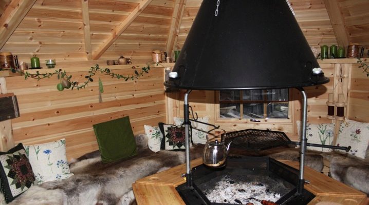- فكر في التخطيط الصحيح. عادة ، يتم وضع شواية مع مدخنة وغطاء عادم في وسط المنزل ، ويتم وضع المقاعد على طول الجدران..