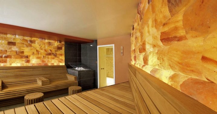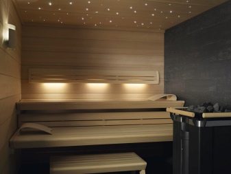 جدران غرفة البخار مبطنة بلوح خشبي يجب وضعه في وضع رأسي. ينتج عن هذا تراكم أقل للمكثفات في الشقوق. لا يمكن أن تكون الأرضية في الحمام الحديث خشبية فحسب ، بل من البلاط أيضًا. المظهر العصري يدعو إلى تركيب تركيبات الإضاءة في أي مكان ، حتى على طول حواف الأرفف.
