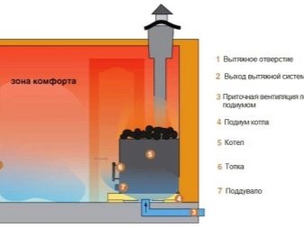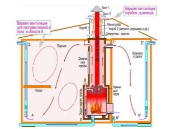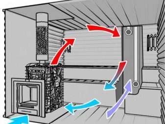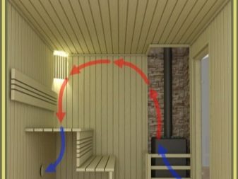 يحدث تدفق هواء العادم من خلال مجرى يوصى بوضعه قطريًا من المدخل. لا تحتاج فقط إلى تهوية غرفة البخار ، ولكن أيضًا جميع غرف الحمام الأخرى.