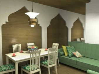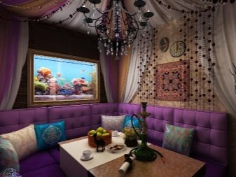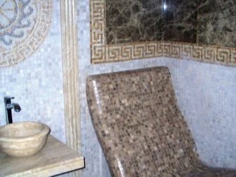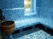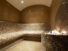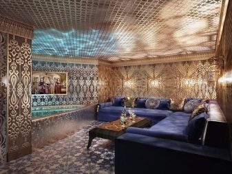 عندما لا تكون هناك رغبة في تحويل الحمام بالكامل ، لا يمكنك وضعه في غرفة البخار ، ولكن في غرفة الغسيل أو حول حمام السباحة. تتحول منطقة الاسترخاء إلى بار للشيشة بلمسات خفيفة. إذا لم يكن ذلك ضروريًا ، يمكن للطاولة ذات الأرجل المنحنية بشكل جميل أن تضيف ملاحظات شرقية. المقاعد مزينة بالفسيفساء على أي حال ، لأن هذا مطلوب بشدة من قبل الشريعة..