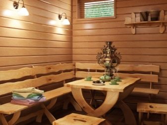 عند الحديث عن العناصر الزخرفية والأناقة ، لا يسع المرء إلا أن يتطرق إلى جانب مهم للغاية – ما هو نوع الأثاث الأفضل وضعه في الحمام. في غرفة البخار ، يجب عليك بالتأكيد تجهيز ستائر ومقعد. يجب أيضًا تثبيت مقعد أو مقعد في غرفة الاستراحة (بالنسبة لها ، هذا هو الحد الأدنى جدًا). الخيار الأبسط مقبول إذا كانوا في الحمام عادوا إلى رشدهم بعد الغسيل ، ثم عادوا إلى المنزل على الفور.