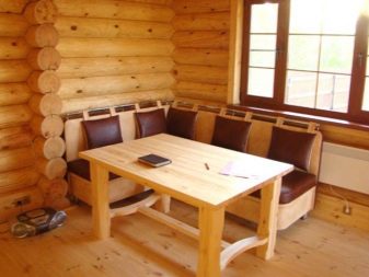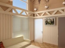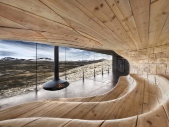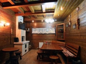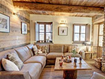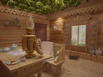 عند مواجهة الخشب من الداخل ، فإن الشرط الذي لا غنى عنه هو استخدام نوع واحد ، وإلا ينشأ تنوع غير سار. من الأصح وضع اللمسات باستخدام الملحقات التقليدية – المكانس والسماور والقبعات وقطع الأثاث السرية. تبدو أي عناصر زخرفية أكثر ربحية في ضوء المصابيح الصفراء الناعمة..