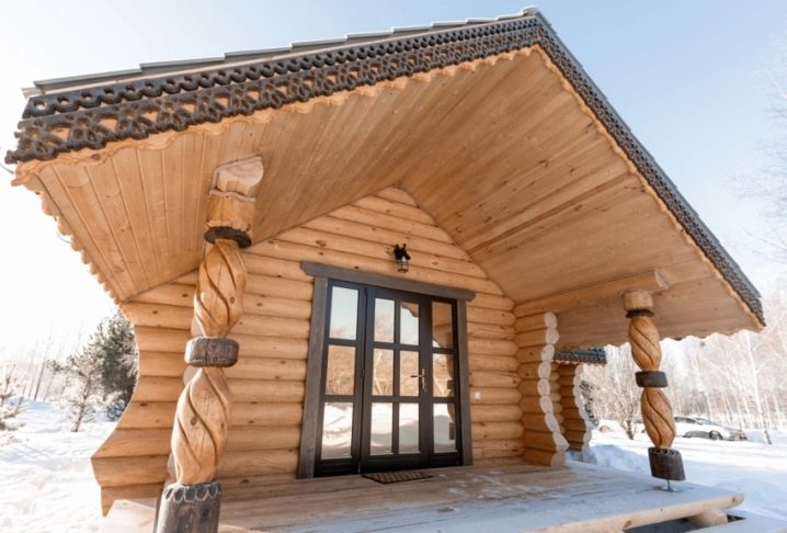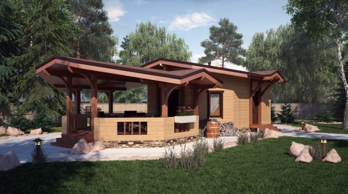 أحد أنواع الحمامات المحتملة بالخارج (من الأمام). السقف الذي يتم دفعه بقوة للأمام مفاجئ في البداية. ولكن بعد ذلك يتضح أن هذه مجرد خطوة أصلية ، وبشكل عام ، فإن المفهوم بأكمله مبني على أقصى درجات الأصالة. ما هي الأعمدة الملتوية على الأقل لدعامات الأسقف المفتوحة ، والتي يتم دمجها بشكل متناغم مع الأسطح الخشبية المنحنية لجدار الواجهة؟.