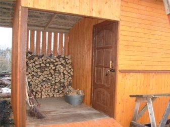 في أغلب الأحيان ، تشتمل المشاريع من هذا النوع على استخدام الأخشاب ، وكذلك الدرابزين المصنوع يدويًا. خيار آخر هو شرفة أرضية ضحلة (2 × 4 م) ؛ من غير المحتمل أن يكون من الممكن احتساء الشاي هناك ، باستثناء شخص واحد أو شخصين. لكن من الممكن تمامًا تجميع الحطب وتخزين الأشياء الأخرى الضرورية في المنزل..