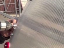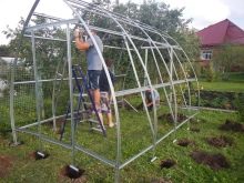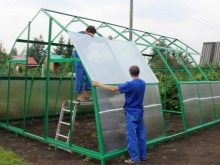 الخطوة الأولى هي عمل الهيكل العظمي للهيكل المستقبلي. يتم قطع الملف المجلفن إلى أجزاء بالحجم المطلوب. يتم تجميع الإطار أو لحامه من العناصر المكونة. لتثبيت ألواح البولي كربونات على الإطار ، يلزم تركيب حشوات مطاطية متخصصة. يتم تحديد ألواح البولي كربونات للحشيات. عند نقاط مفاصل التراكب ، يتم تثبيت التراكبات المعدنية بواسطة براغي ذاتية التنصت. وبالتالي ، من خلال بناء دفيئة ، باتباع جميع التوصيات ، وكذلك العناية بالكروم بمعرفة هذا الأمر ، يمكنك الحصول على نتيجة ممتازة..