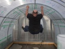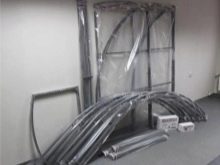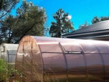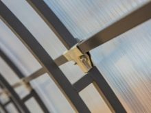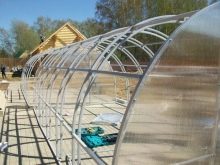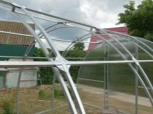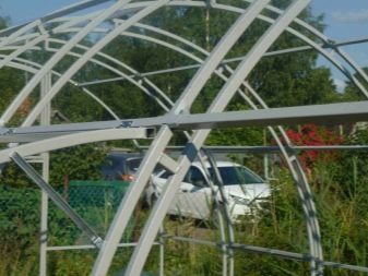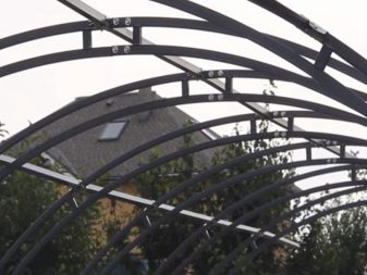 - يكتسب الهيكل قوة متزايدة بسبب ربط عدة أنابيب في قوس ، دون وجود جزء كبير بينهما – بحد أقصى 5 سم ، والمعدن المستخدم في الإنتاج من الصلب بقسم 20 × 20 مم. يتم تثبيت الجملونات المقوسة نفسها مع بعضها البعض برباطات ومشابك..