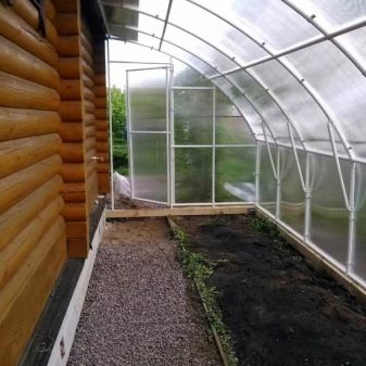 الآن دعنا نفكر في الأنواع المسماة بمزيد من التفصيل. عادة ما يتم الانتهاء من حلول الجدار في الجدار الجنوبي أو الجنوبي الغربي للمنزل أو أي غرفة أخرى. في هذه الحالة ، سيكون الجدار نوعًا من الكتلة الحرارية. أثناء النهار ، ترتفع درجة حرارتها ، وفي الليل تنبعث منها حرارة ، مما يسمح لك بتقليل متوسط انخفاض درجات الحرارة اليومية بشكل كبير ، وكذلك حماية النباتات في الدفيئة من تأثيرات الرياح القادمة من الشمال. في مثل هذه البيوت الزجاجية البلاستيكية ، يتم إنشاء مناخ محلي مناسب للغاية للنبات ، وسيكون سعرها منخفضًا جدًا..