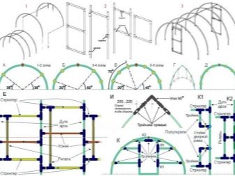 الآن دعنا نتحدث عن تجميع إطار الدفيئة. عادة ، تبدأ هذه العملية بشراء الأطوال المطلوبة من الأنابيب البلاستيكية. بعد قصها من الأفضل التوقيع على الأبعاد حتى لا يتم الخلط بينها. تبدأ عملية البناء الآن. أولاً ، يتم أخذ الأنابيب لـ 5 أقواس من الفئة المتوسطة ، والتي يتم لصقها في أزواج باستخدام الصلبان. الآن يتم توصيل الأقواس من النوع النهائي وفقًا لخيار 3 نقاط توصيل و 4 قطع من الأنابيب. يجب أن تشكل القطعتان أقواسًا جانبية ، متصلة بالمحملات بزاوية 45 درجة بحيث عند ثني القوس في القوس ، فإن مآخذ الإنطلاق ، التي تكون حرة ، تنظر إلى الأسفل. بعد ذلك ، سيكون من الضروري إرفاق الرفوف بها ، والتي سيتم استخدامها لتشكيل المدخل.