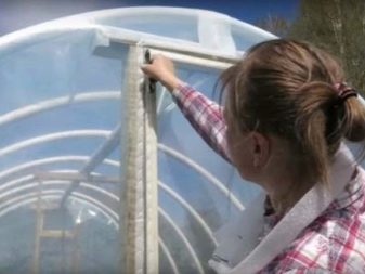 بعد اكتمال الإطار ، يبقى المضي قدمًا في تغليف الهيكل. دعونا نرى كيفية القيام بذلك باستخدام مثال البولي إيثيلين. من الأفضل القيام بذلك عند درجة حرارة حوالي 20 درجة مئوية ، حتى لا تتدلى المادة في المستقبل. يتم تثبيت البولي إيثيلين بمشابك ، مما يجعل من الممكن ، إذا لزم الأمر ، شد الفيلم والتخلص من الترهل. عندما يلامس الفيلم الأرض ، يمكنك رشه ووضع بعض الأوزان فوقه.