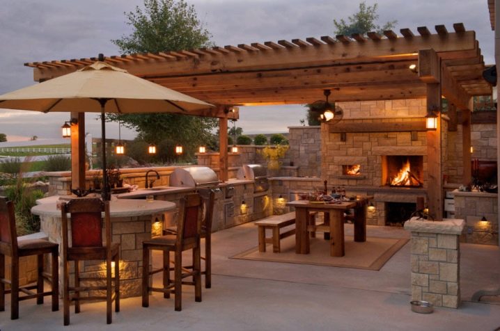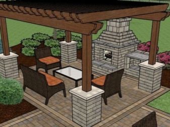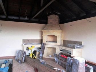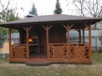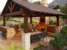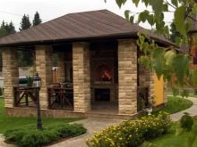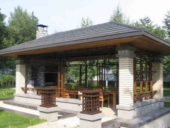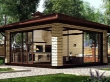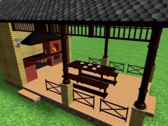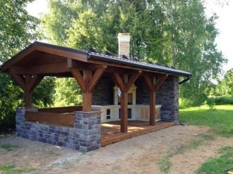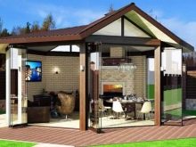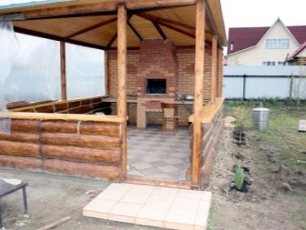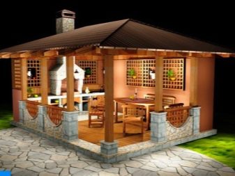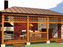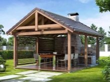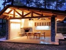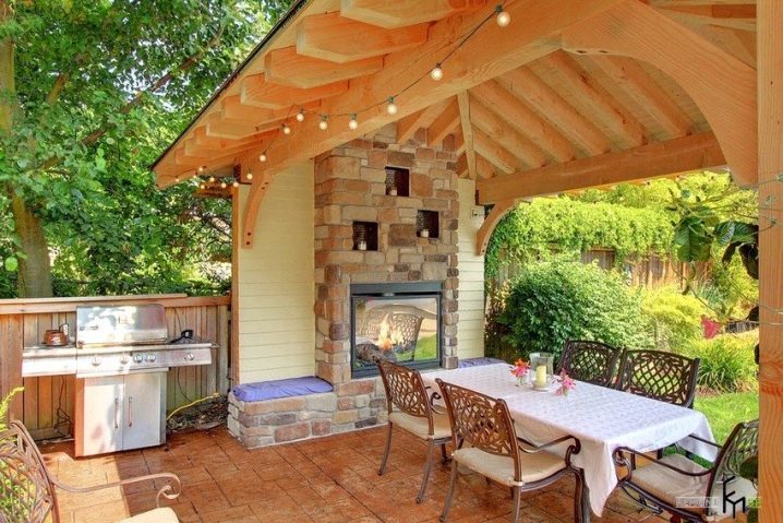 يمكن أن تكون الشرفة المجهزة بموقد محدودة الحجم ، وتستهدف عائلة صغيرة. طاولة طعام مثبتة تحت السقف ، من السهل أن تتجمع حولها الأسر. التصميم الأصلي للسقف بحجم معين بواسطة عوارض خشبية يجعل الهيكل غير عادي ، وبسبب المساحة الكبيرة المبطنة بأحجار الرصف ، تظهر مساحة إضافية للضيوف.