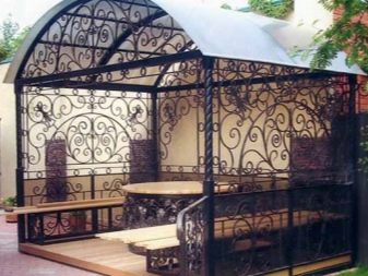 إذا احتاج الملاك إلى شرفة المراقبة التي سيتم استخدامها فقط في أيام الصيف الحارة ، فمن الجيد أخذ المعدن للبناء. يمكن أن يكون هيكلًا مزورًا به درابزين مفتوح وأعمدة حديدية تدعم المظلة. سيبدو هذا الهيكل جذابًا للغاية. في الوقت نفسه ، لن يستغرق الأمر وقتًا طويلاً لتثبيته ، ولن تشتعل النيران في المبنى أثناء التشغيل ، خاصةً إذا كان الداخل به حد أدنى من العناصر التي يمكن أن تشتعل..