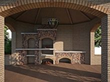 تعتبر الشرفة المفتوحة مع سقف الجملون مثيرة للاهتمام لتصميم الفرن نفسه ومنطقة الطهي ، المصممة بروح مجموعة المطبخ الزاوية. يعطي البناء بالطوب المحكم للشرفة قيمة معمارية خاصة. سيكون المطبخ الصيفي مناسبًا لكل من المضيفة وضيوفها..